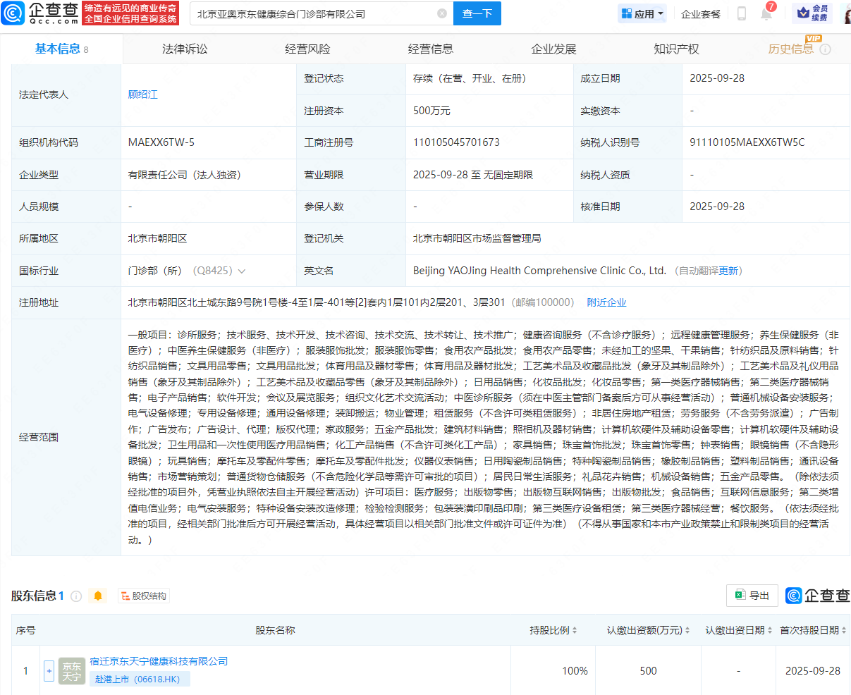 近日,北京亚奥京东健康综合门诊部有限公司成立,法定代表人为顾绍江,注册资本500万元最好的配资官网,经营范围包含诊所服务、远程健康管理服务、服装服饰零售等,由宿迁京东天宁健康科技有限公司全资持股。